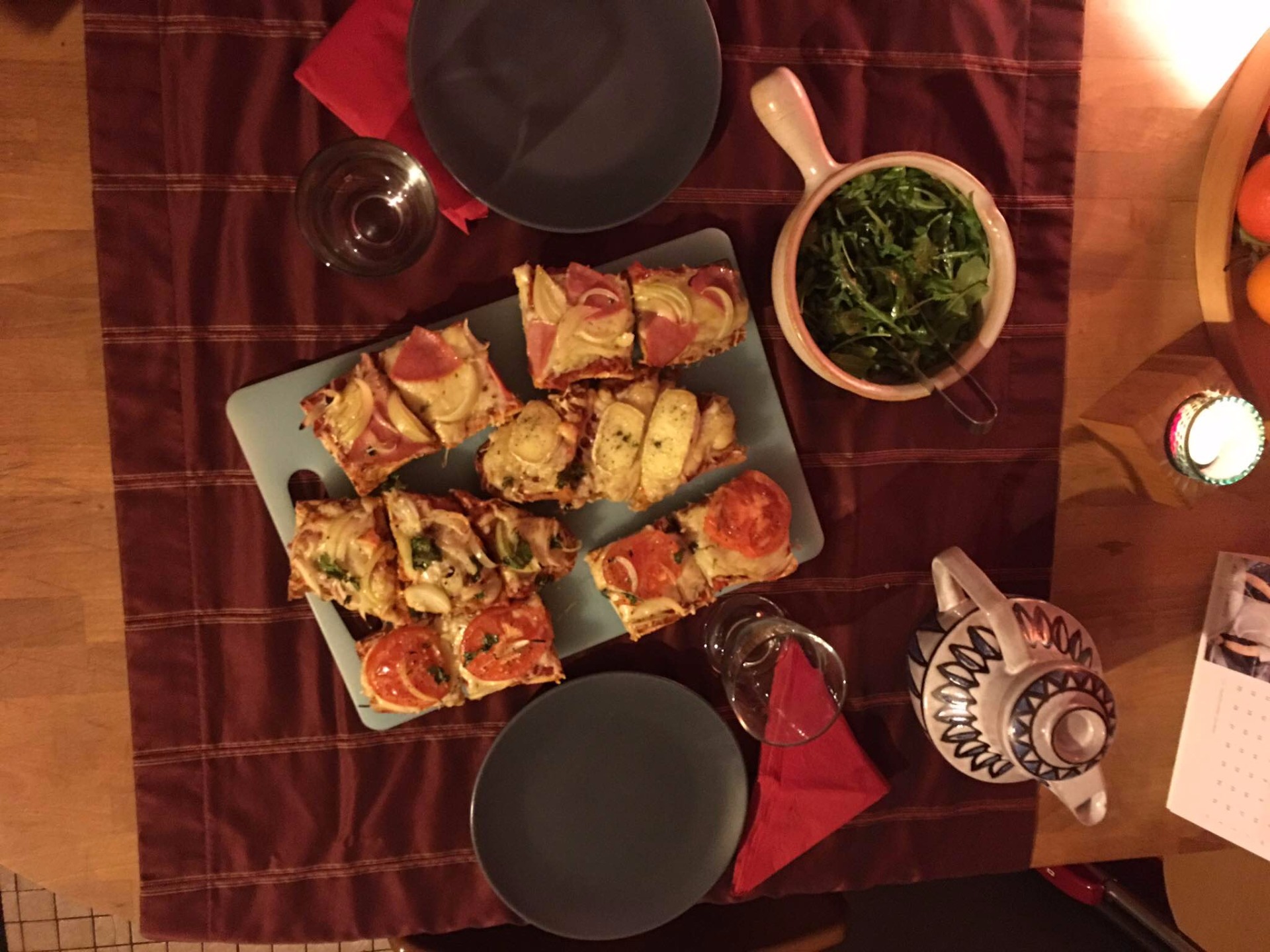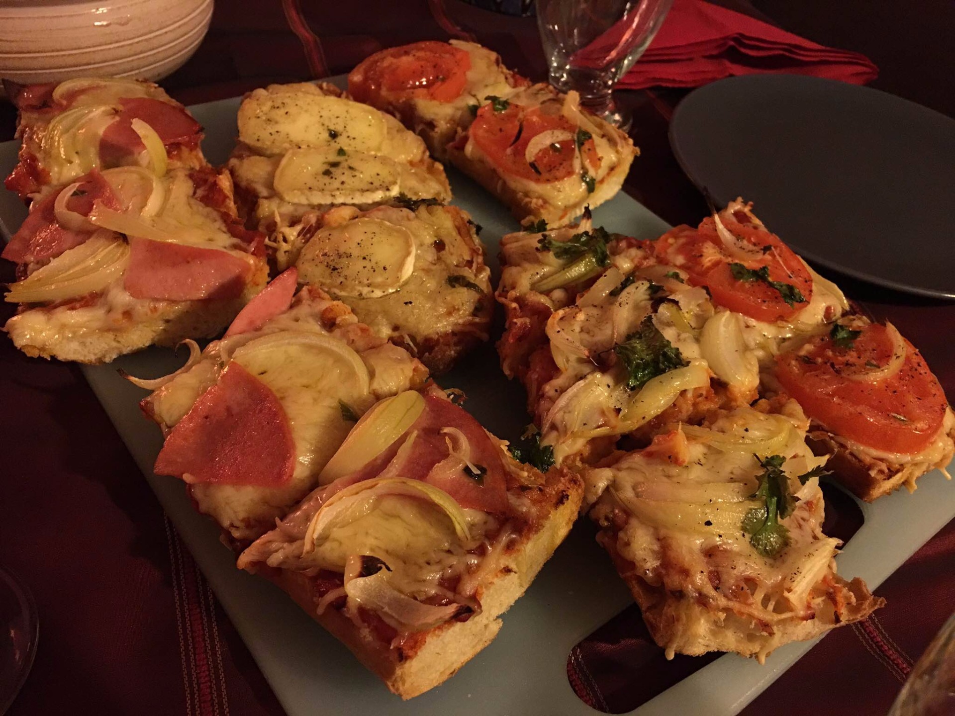 Corte as baquetes ao meio , espalhe o molho de tomate sobre cada uma das metades e polvilhe com um pouco de queijo ralado , por cima , na primeira coloque as fatias de fiambre e a cebola , na segunda coloque o brie , a cebola e salsa picada , na terceira as rodelas de tomate , algumas meias luas de cebola e a salsa .